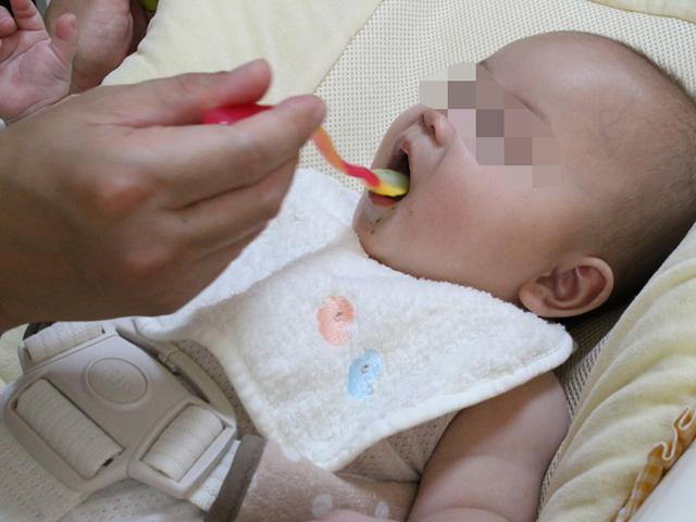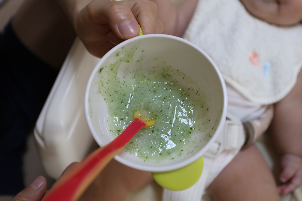 離乳食は順調で、最近はほうれん草がゆを食べさせています。