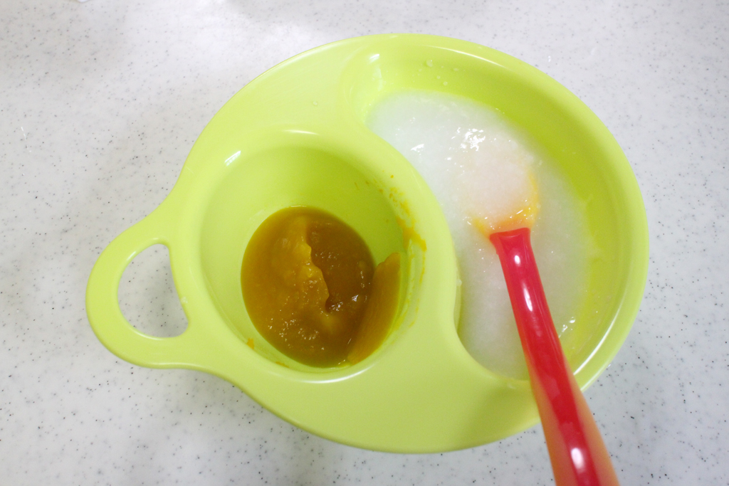 カボチャの裏ごしのみをお湯でのばして、お粥の合間に食べさせてみました。