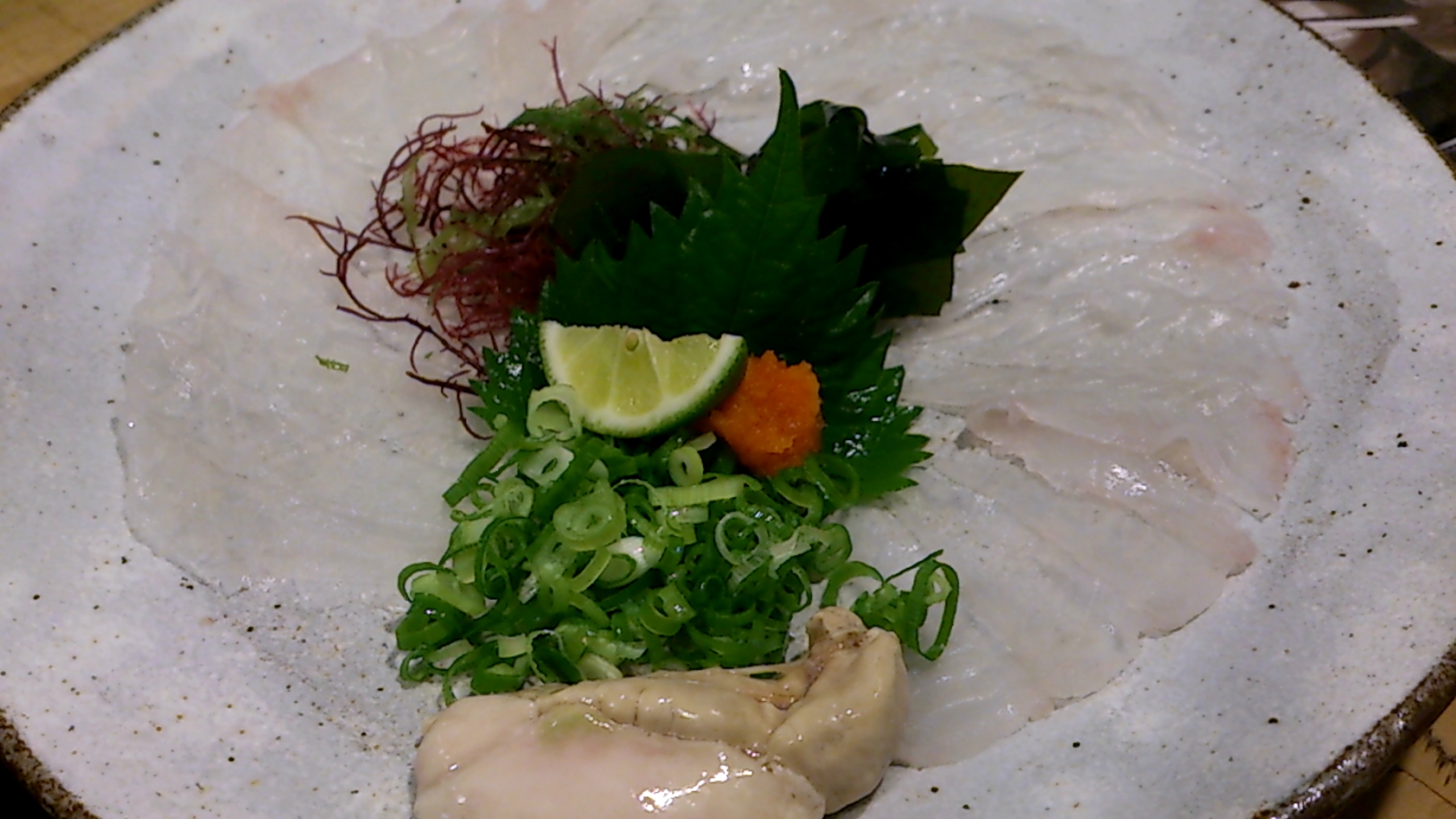 添えられた肝をポン酢で溶いて、そこに薄造りを浸けて食べるのですが、