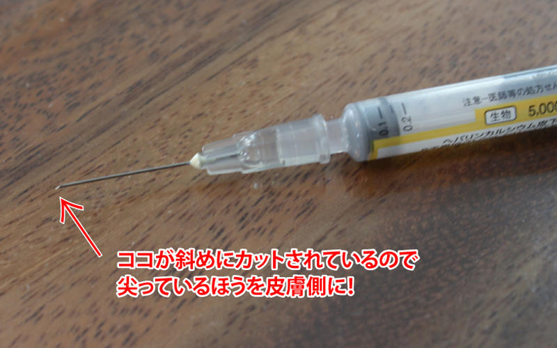 針の方向に気をつける(針先の尖っているほうが皮膚側になるように刺す)。