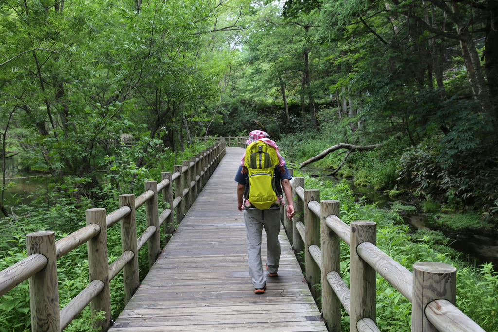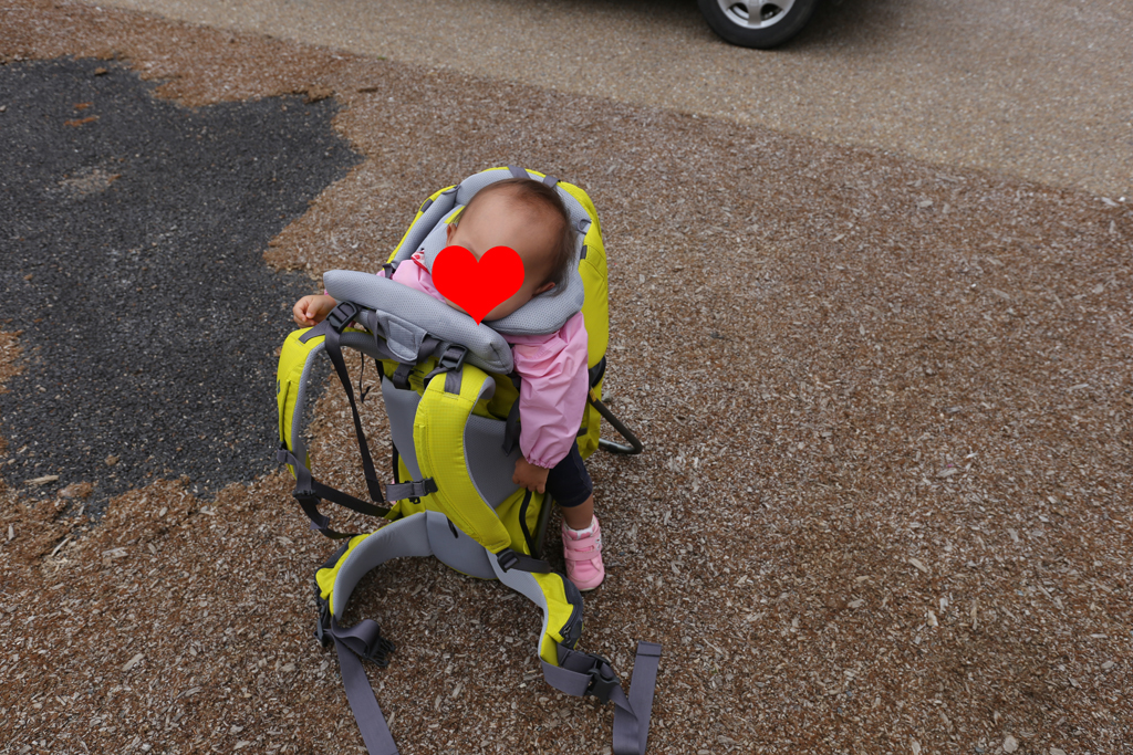モンベルのキャリアに入れて、歩きます。