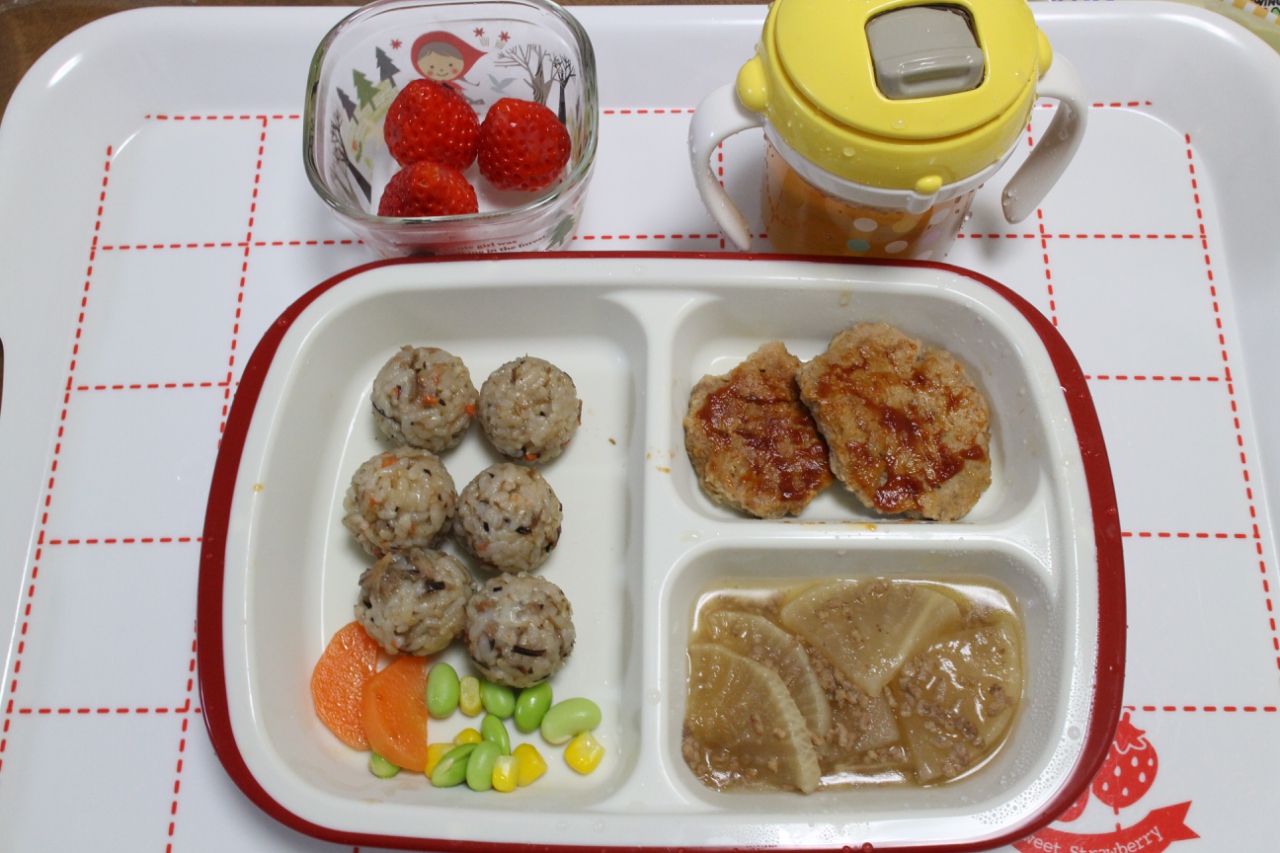 時間ある時は、手づかみ用におにぎり作って。あとはおかず2品程度と、フルーツ。